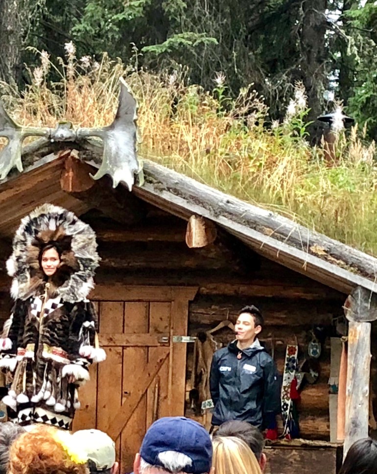 One of the highlights of the tour was a visit to a recreated Athabascan Indian village. Our tour guides were young Athabascan Indians. Many of them were headed to college after the summer tourist season was over. Their culture survived for over 10,000 years and it was only in the last century that they had contact with Western civilization. Our tour guides show us a traditional coat worn by their ancestors.