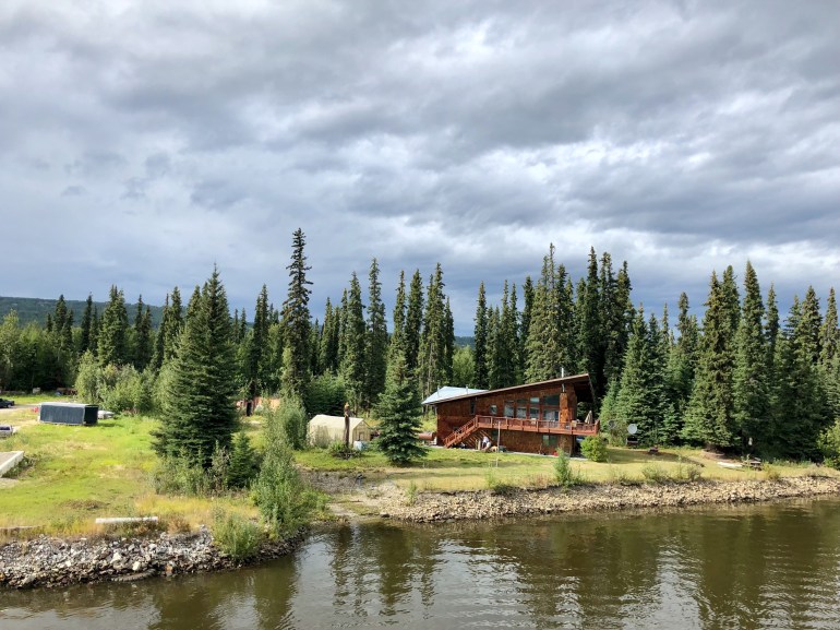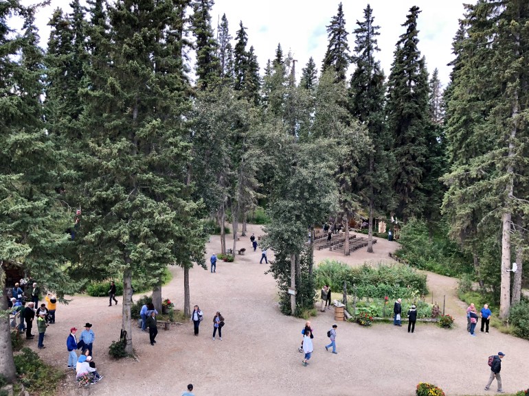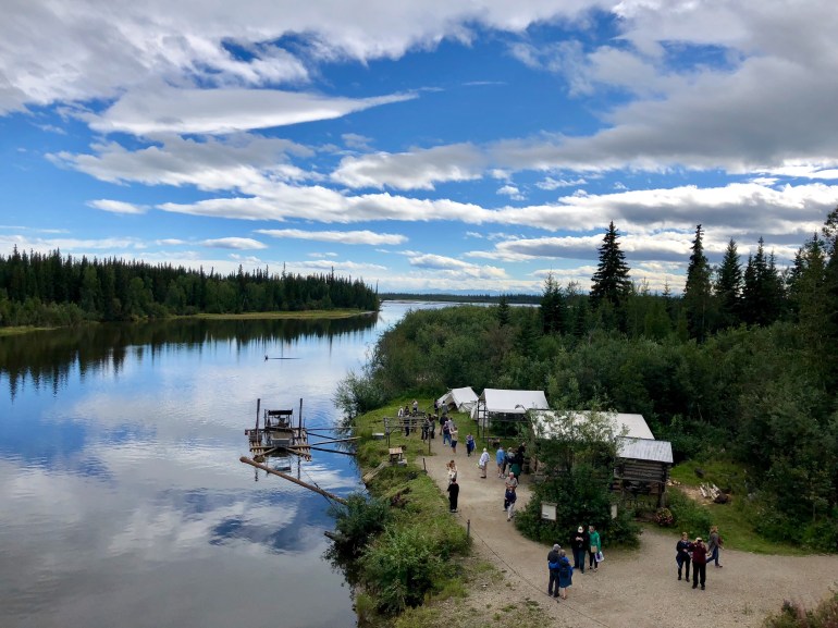 As part of the tour we were allowed to explore the village. It had cabins made of spruce logs, a cache for storing supplies, and a salmon fish wheel and drying rack.