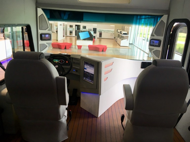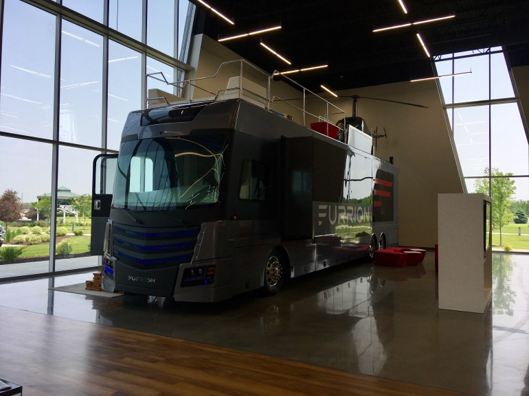 Having just visited the early days in RV living, it came as a shock to board the futuristic class A motor home that lives at the Furrion corporate offices. Furrion takes this RV to any event where they want to draw special attention to themselves.