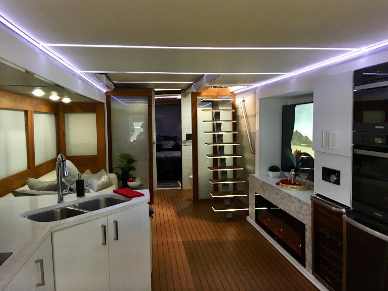 Besides the oven, microwave, dishwasher, and residential refrigerator, there’s the big screen television, fireplace, and wine fridge.