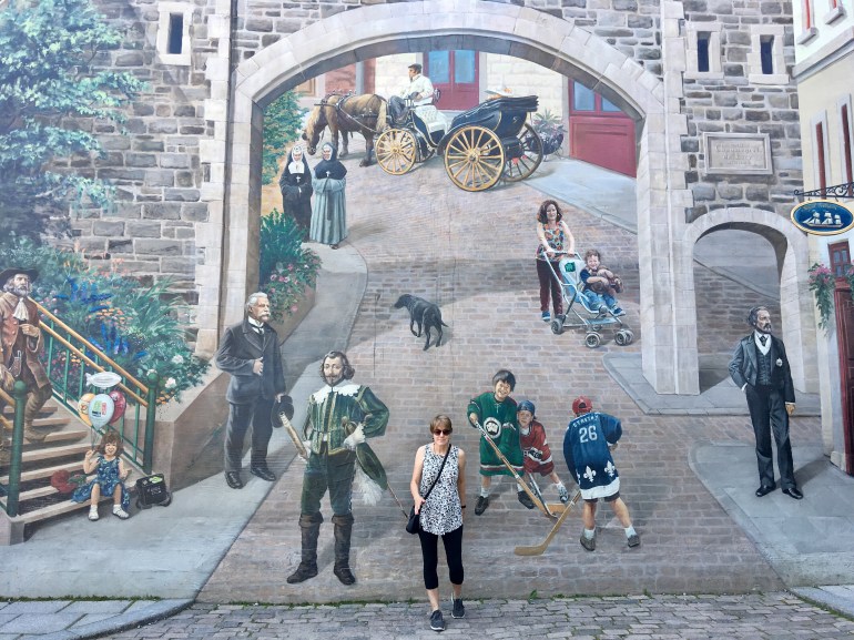 Denise appears to walk out of some of the amazing wall art in Quebec City.