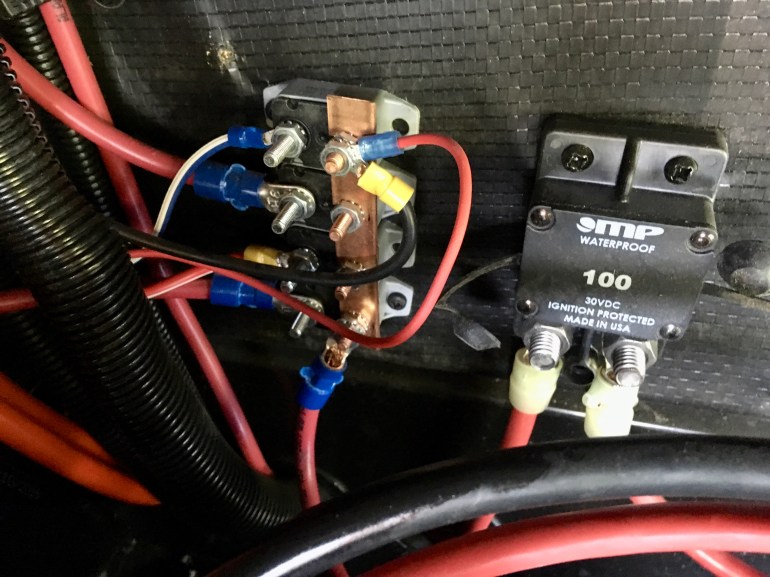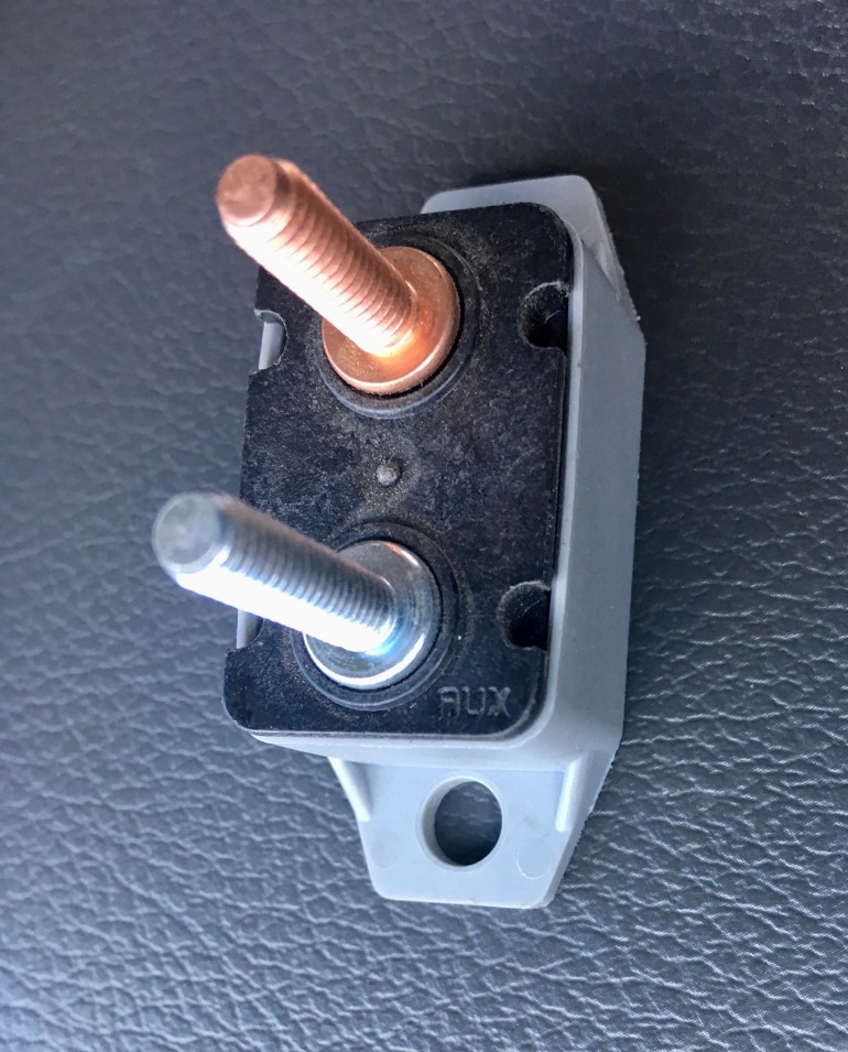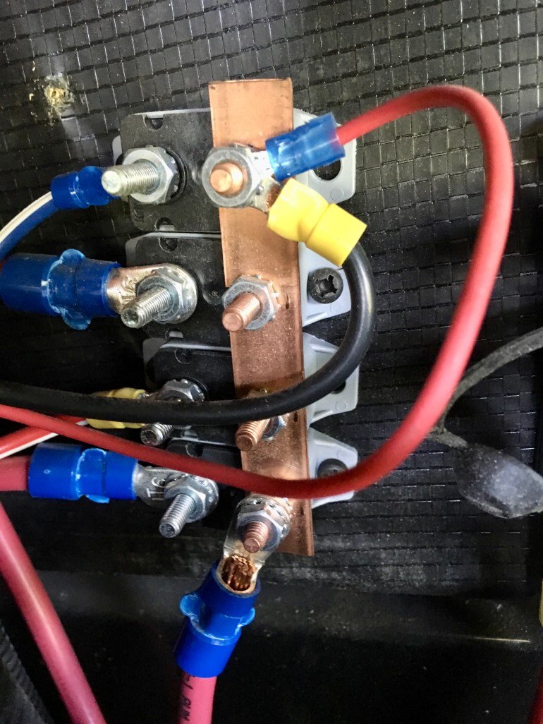 After a bit of internet research we knew what was wrong. It turns out the problem lies with a $5.00 breaker. By the way, that is $5.00 Canadian so about $3.75 in U.S. dollars. There are four 50 amp breaker switches hiding behind that vertical copper strip with all the wires attached to it. One of these little guys went bad and caused all the problems.