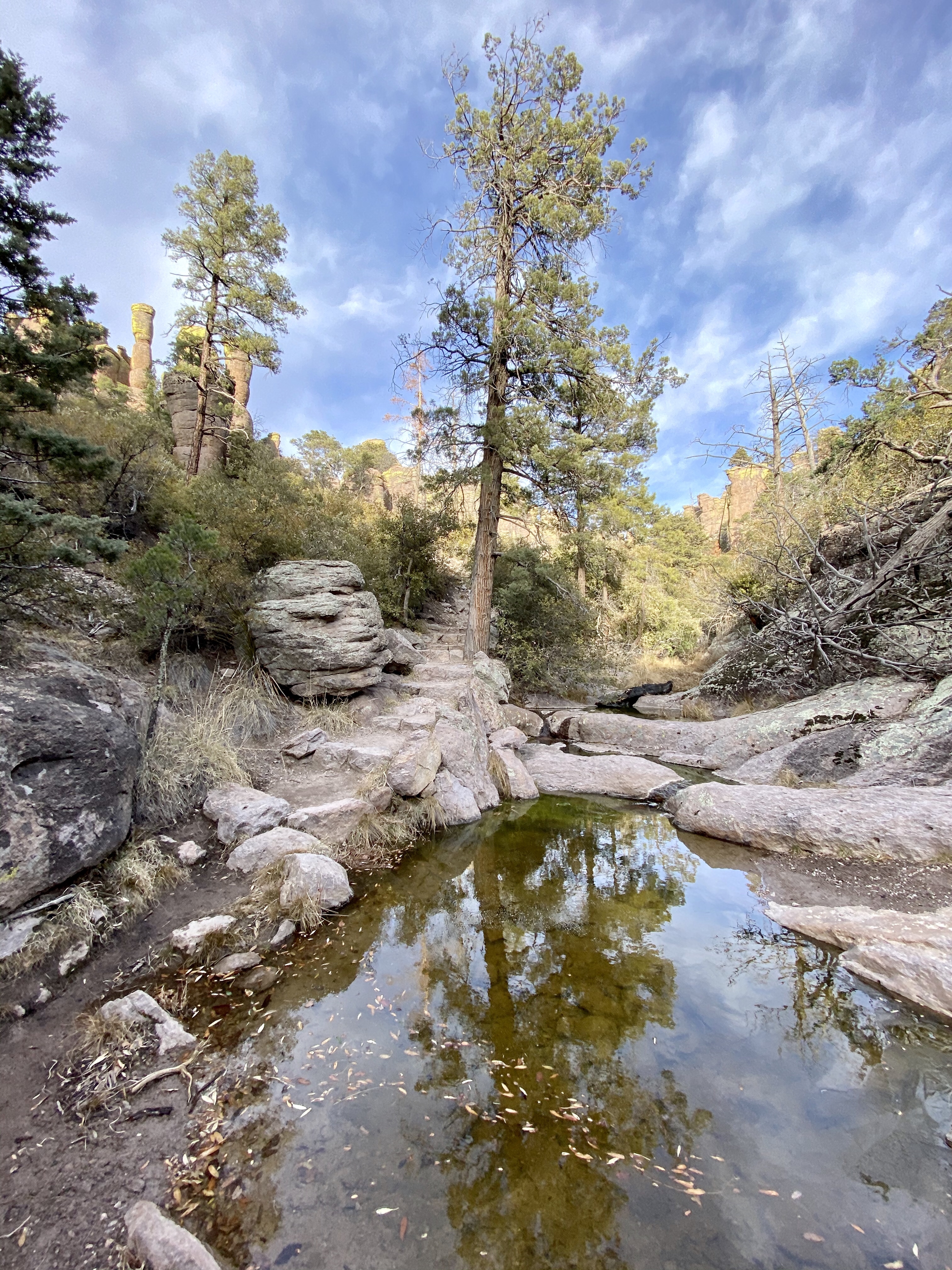 A neat water feature with pillar-like rocks nearby.