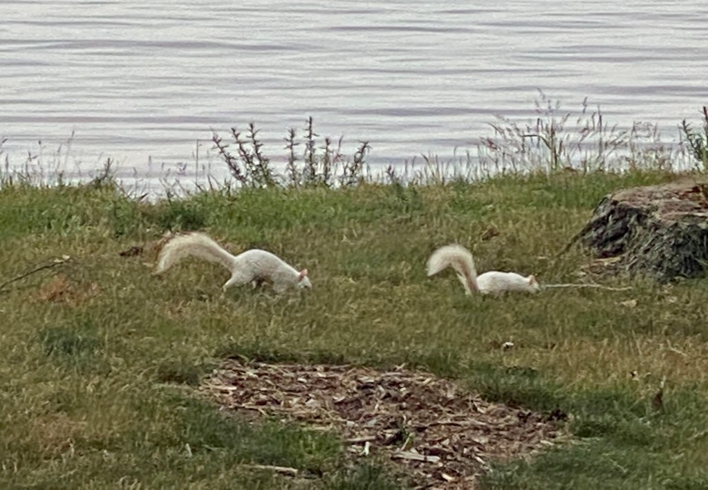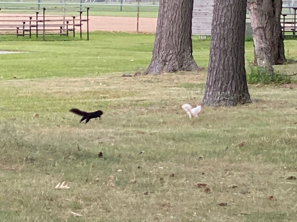 To give you some idea of how unusual this is, the odds of seeing a melanistic black squirrel is one in 10,000. The odds of seeing a white albino squirrel is one in 100,000. So what are the odds of seeing two albinos and one melanistic squirrel at the same time? As you can see theses squirrels were having fun just playing in the park.