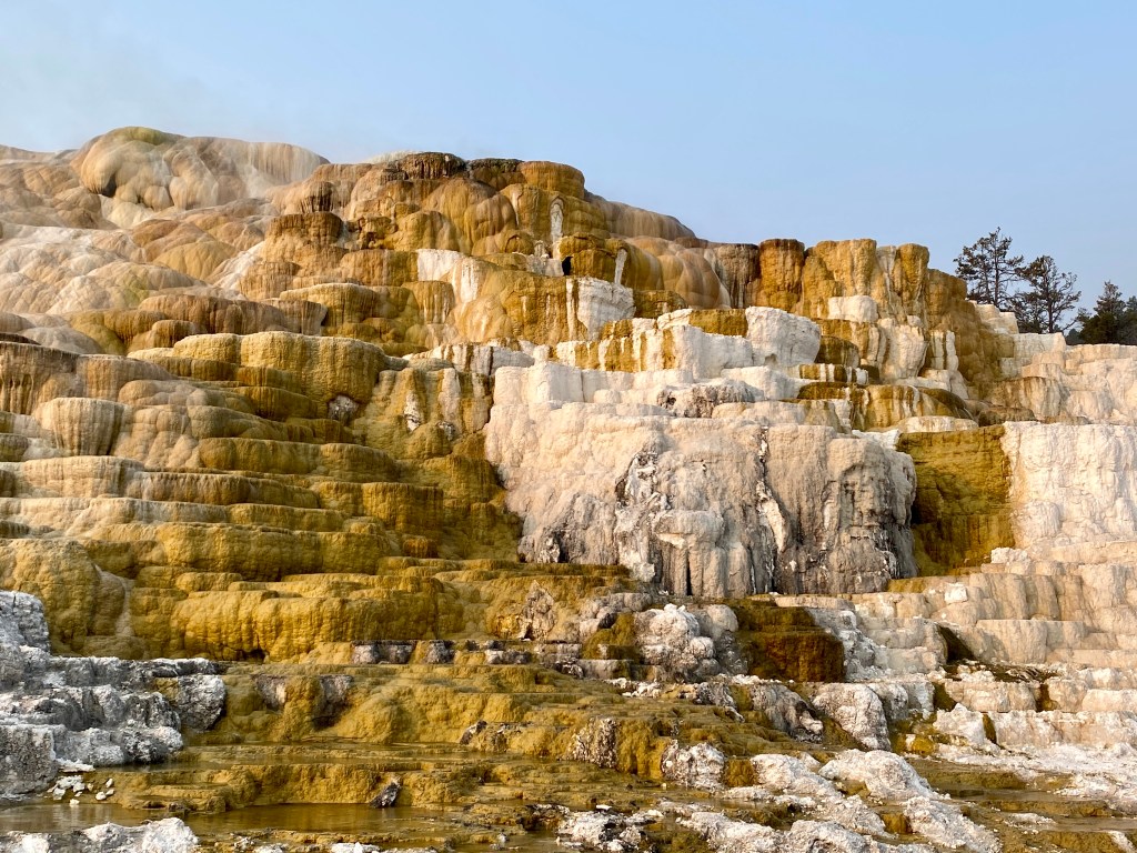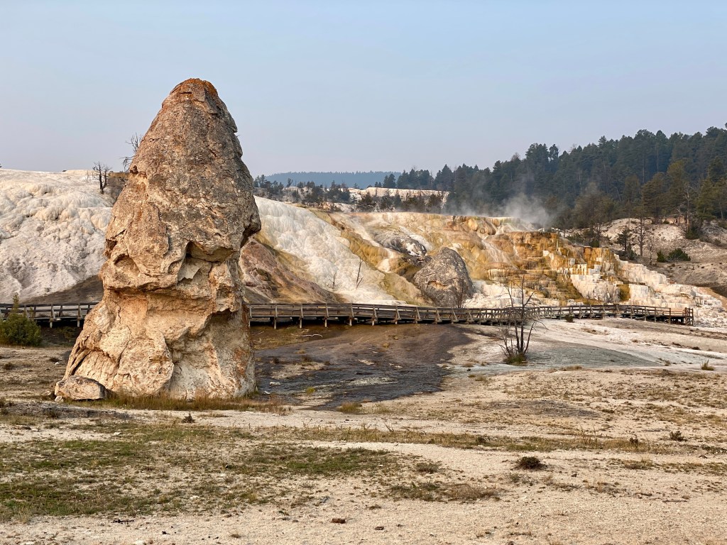Our first view of Mammoth Hot Springs. You can see the strange rock formations as well as the steam coming up from the springs.