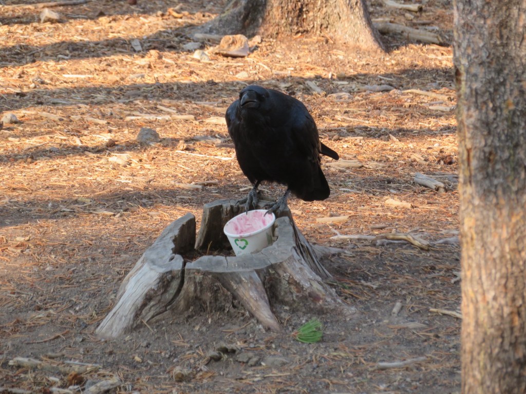 This raven was amazing. He was trying to get the rest of the yogurt out of this cup. He placed the cup into the hole in the tree stump to keep it in place. We watched him for several minutes as he worked to get the yogurt.