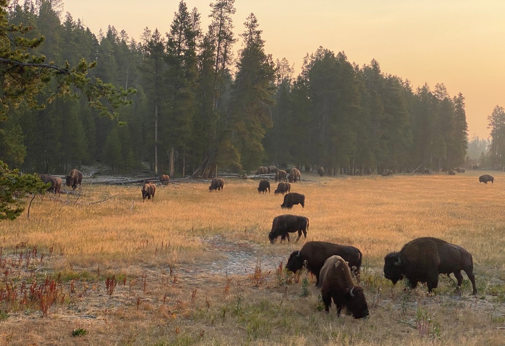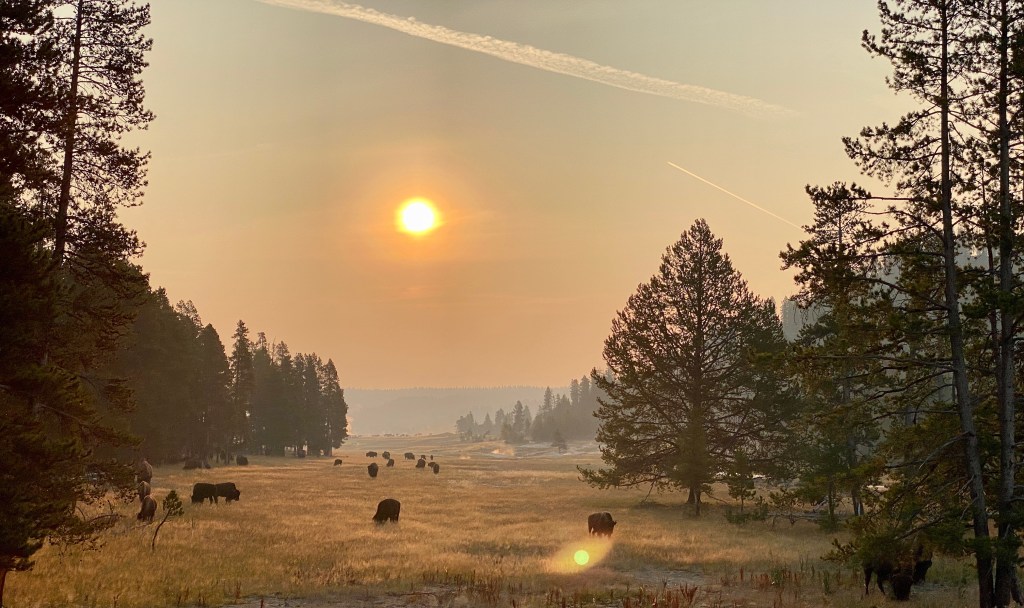 Bison at sunset. Notice the hazy skies. There were a lot of wildfires in the area and the skies were like this during much of our visit.