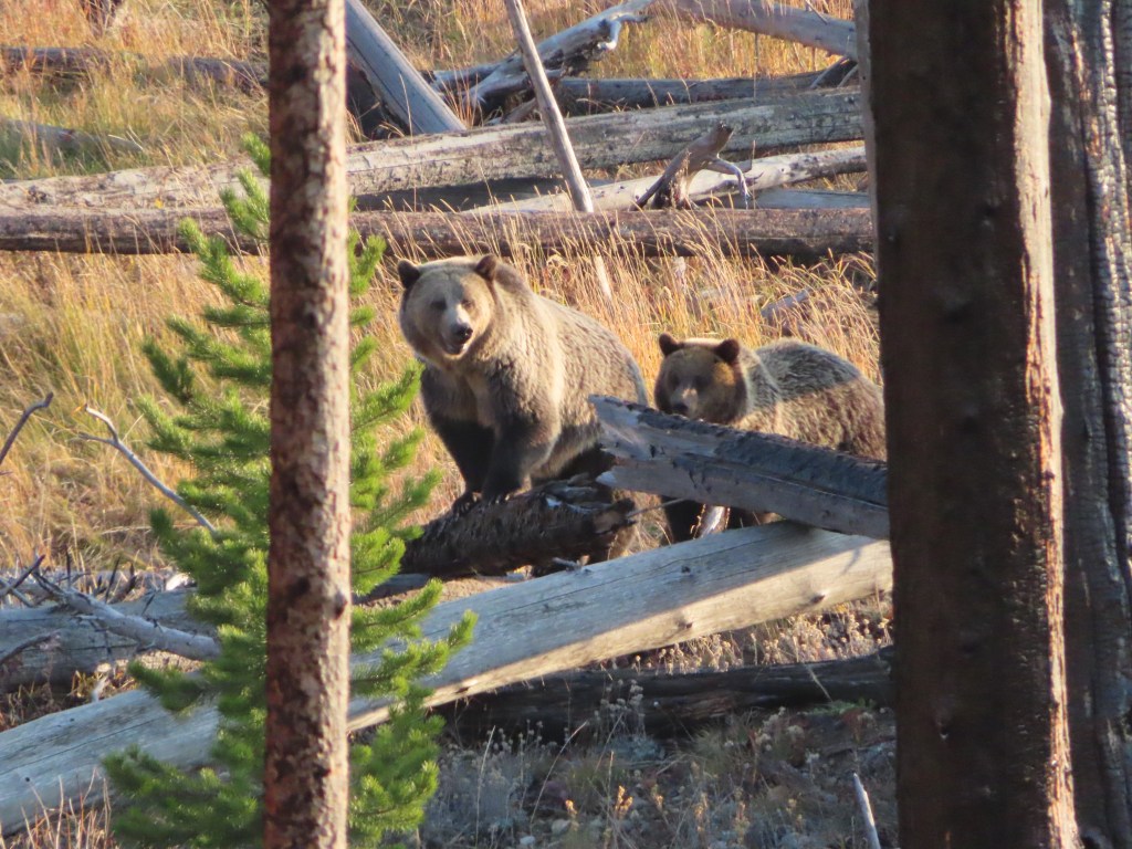 Grizzly bear and her cub. They were trying to cross the street but the crowd that they attracted kept them from crossing. We got our pictures and left, mostly because we felt she was looking straight at us asking us to leave.