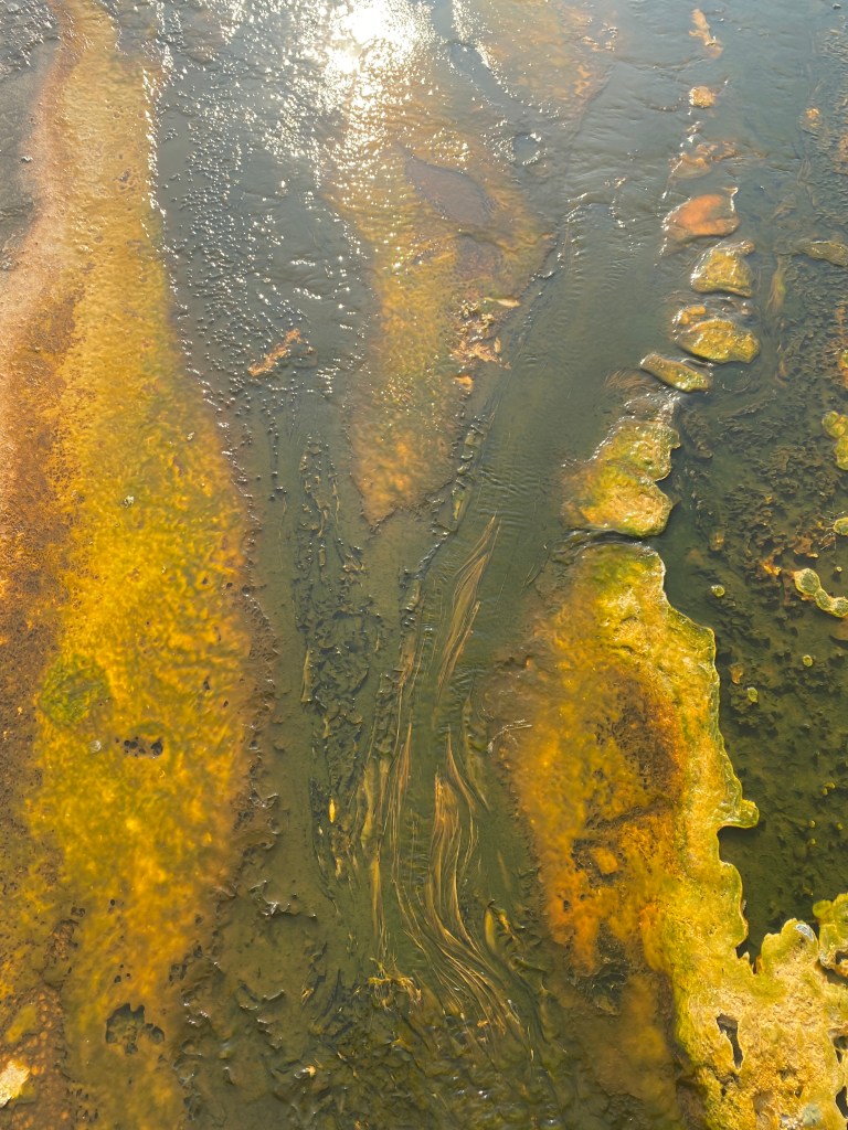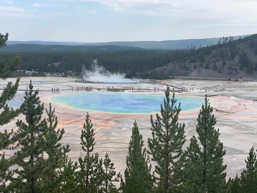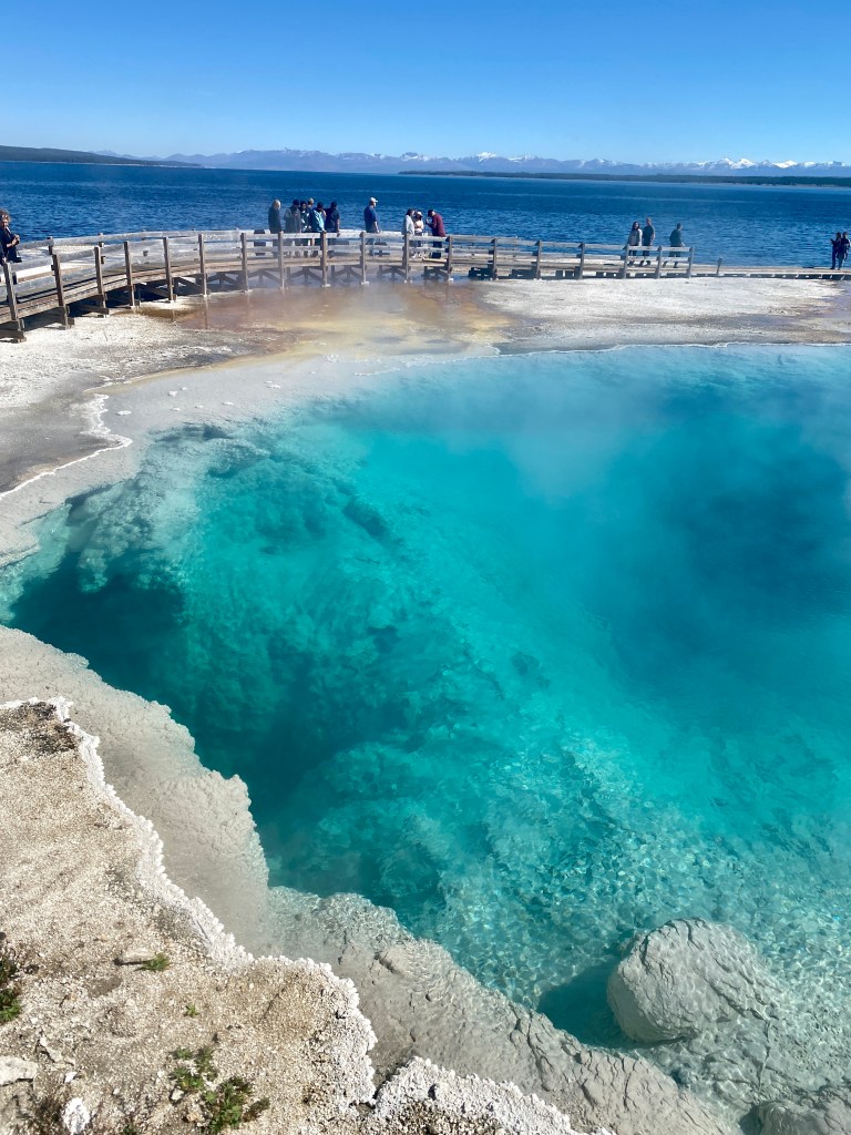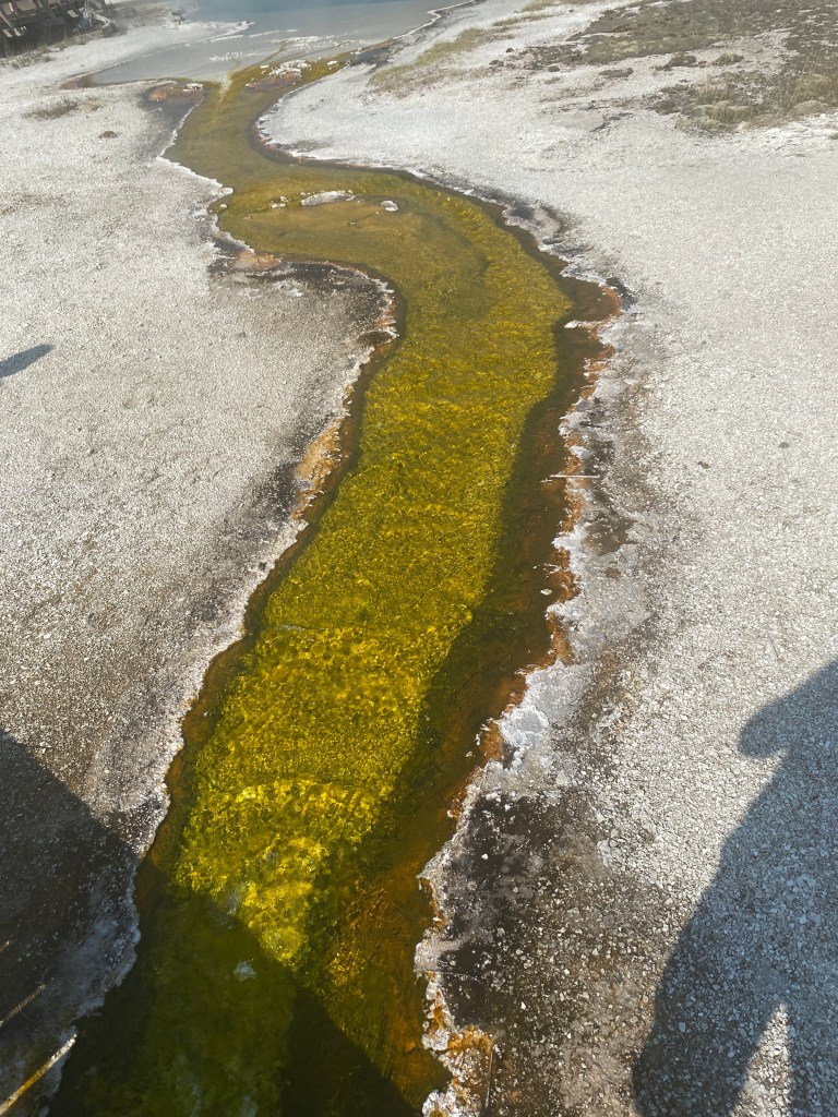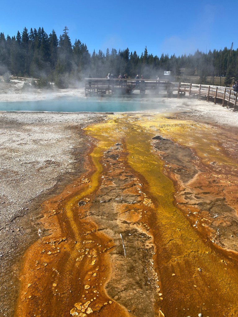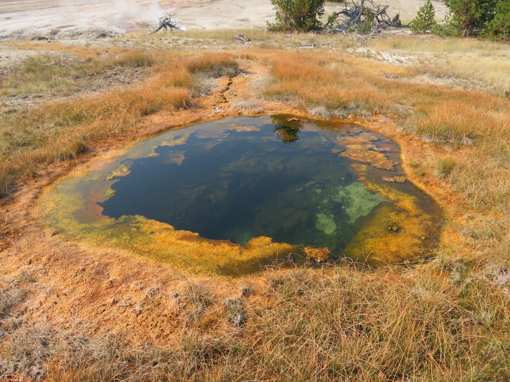 Incredible colors are common at Yellowstone, especially the pools of water. The pools are a variety of colors. The water is very hot and acidic. It is hot enough to blister your skin and as acidic as the liquid from a car battery. The deep aquamarine water is so hot that nothing lives in it, making the water clear and a blueish color. The other colors of water come from microbes living in the water. The result is a rainbow of colors from blue, to orange, red, green, and yellow. Enjoy the colors.