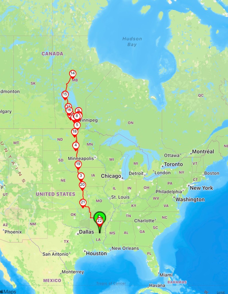 We are currently in Manitoba, Canada and we have seen several interesting places. Details to follow.