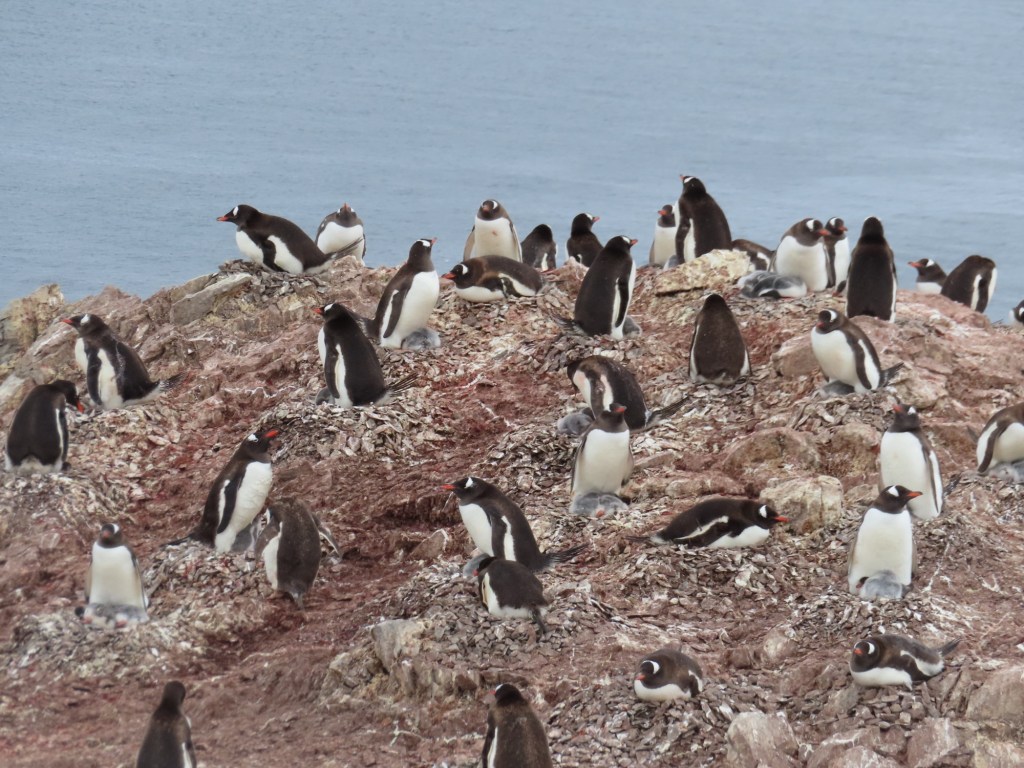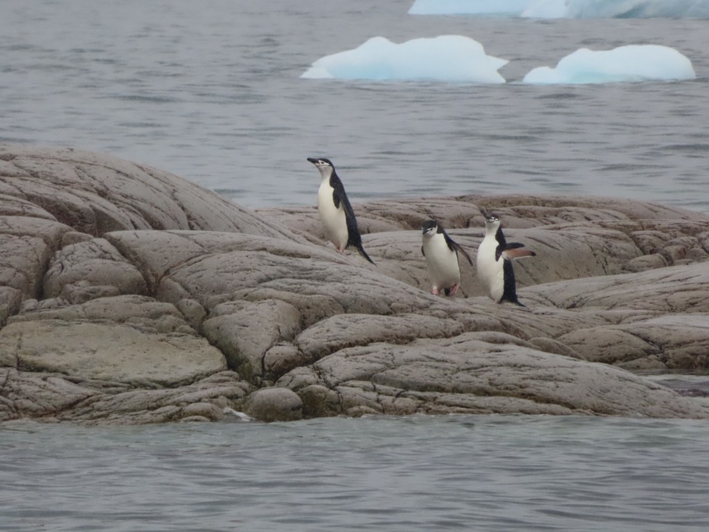 This picture was taken from the mainland. These chinstrap penguins swam up on a rock across the small bay.