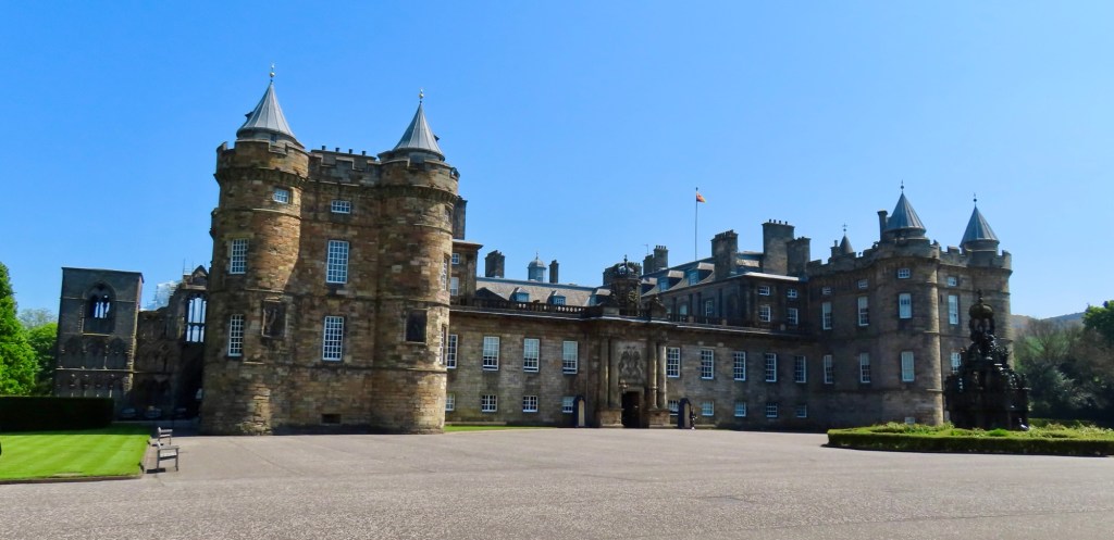 Holyrood Palace in Old Town Edinburgh is at the base of the Royal Mile, with Edinburgh Castle at the upper end. It is the royal Scottish palace built in the early 1500s. The history of the site goes back much further than that. There was an Abbey next to the palace which dates back to 1128. The abbey has been long abandoned and is now a ruin.
